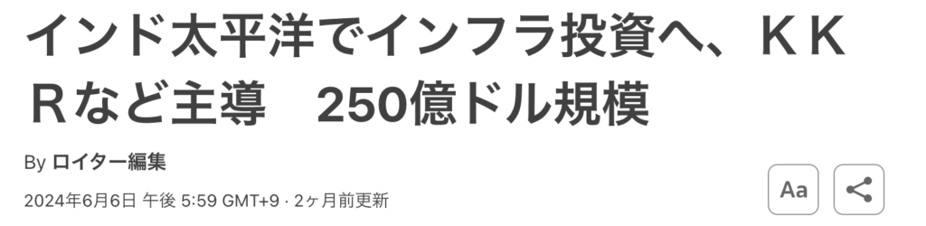 そして、KKRやグローバル・インフラストラクチャー・パートナーズ、インド太平洋パートナーシップ・フォー・プロスパリティ―が中心となって、インド太平洋地域のインフラに240億ドルを投資するとの発表があったり、