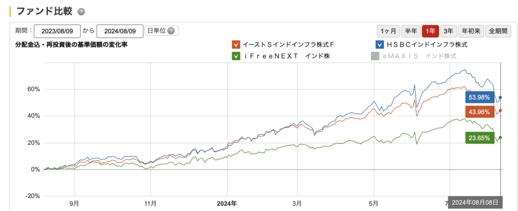 以前、紹介しました「HSBCインド・インフラ株式オープン」が、新NISA成長投資枠 利回りランキング(2023年8 月〜 2024年7月)において1位(+68.35%)になっておりました。