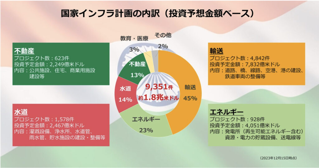 なお、インド政府が推進するインフラ計画では総額1.8兆米ドルのインフラ投資が計画・実行されています。