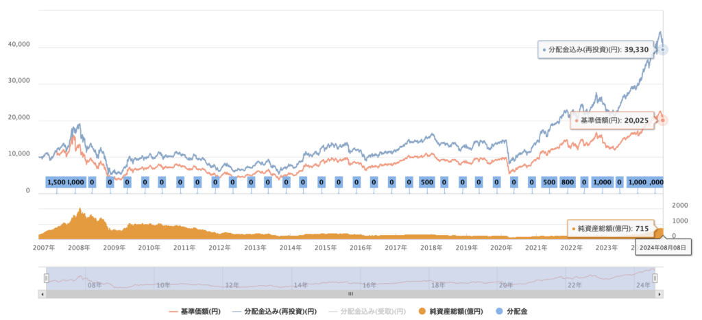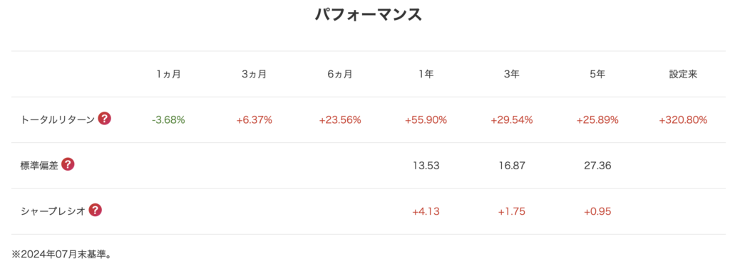 専用ページでパフォーマンスを確認すると、この1年間のトータルリターンは+55.90%、設定来のトータルリターンは+320.80%と基準価額は約4倍となっております。