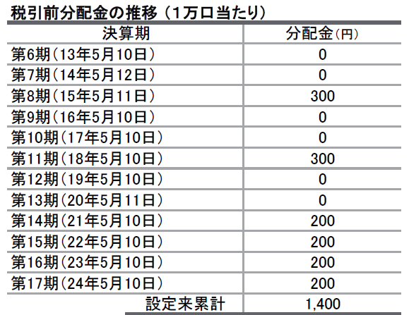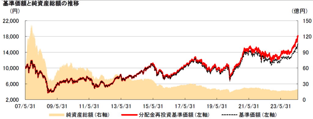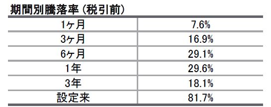 直近1年で+29.6%、3年で+18.1%の騰落率になります。直近分配金は上記の通りです。