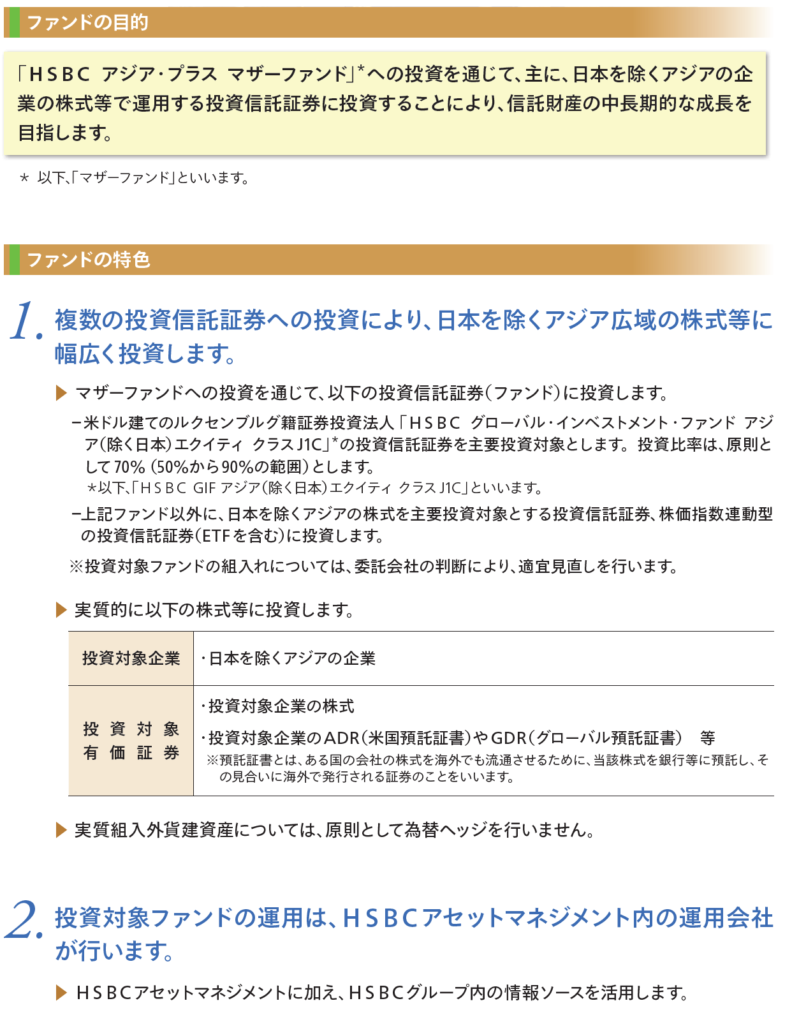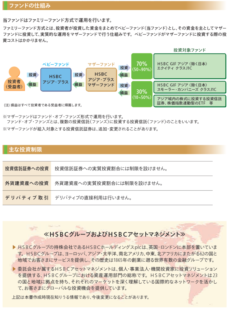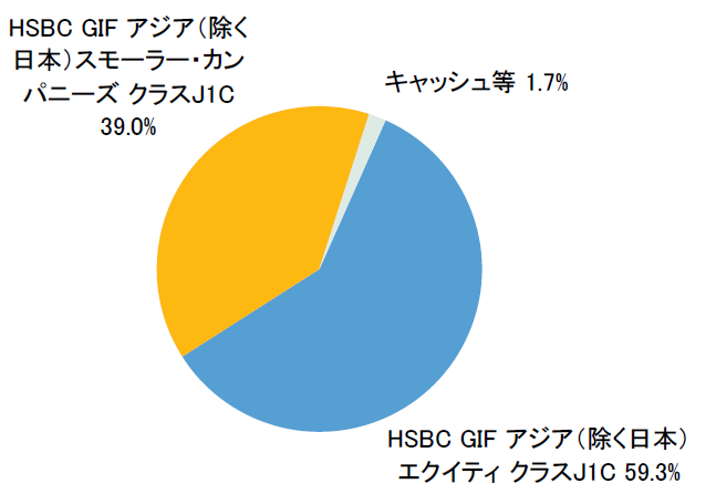 ファンド・オブ・ファンズ形式で複数のファンドを利用し日本を除くアジアの企業に幅広く投資します。投資先ファンドはHSBC GIF アジア(除く日本)エクイティ クラスJ1C、HSBC GIF アジア(除く日本)スモーラー・カンパニーズ クラスJ1Cの2つがメインになります。