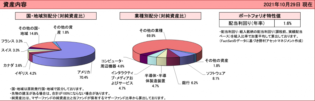 このファンドの最新のマンスリーレポートを見ると、現在(10月29日)の組入銘柄数は1,286銘柄、国別配分ではアメリカ70.4%も占めています。