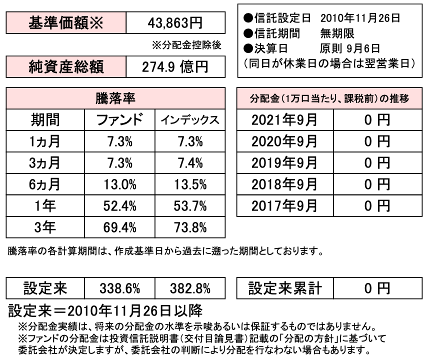 2020年11月26日の設定以来、基準価額は下げたりするタイミングはあるものの、設定来のリターンが+338.6%、この1年でも+52.4%と順調に推移しております。
