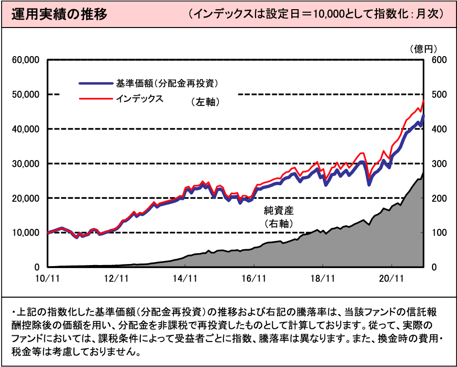 ファンドを購入する際の購入手数料が必要ですし、毎年の運用管理費用(信託報酬) が0.605%とコスト負担がありますので、運用する中身が同じであれば、手数料無料で運用管理費用(信託報酬)も安い先進国株式インデックスで運用した方が良いですね。