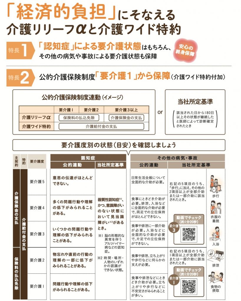 これまでの介護保険は、「要介護2以上」でないと給付対象外であったり会社独自で定めた介護保障制度に沿ってとか曖昧な感じでしたが、こちらの保障は「要介護1」で公的介護制度に連動しているのでその点はいいと思います。