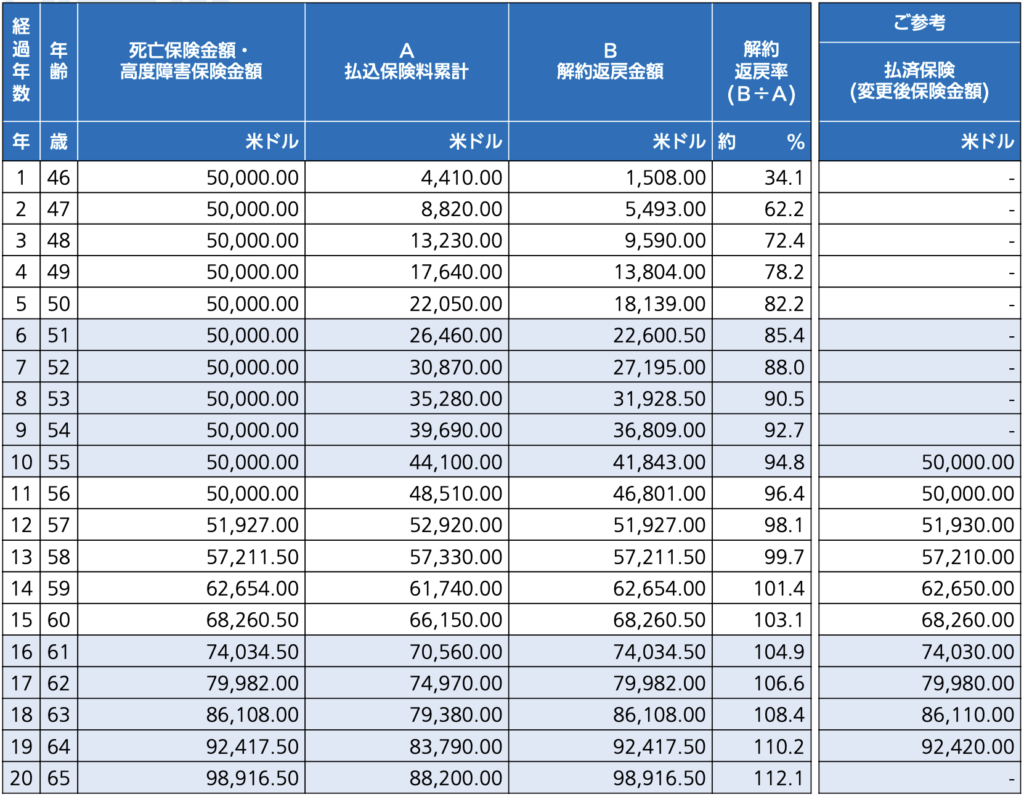 14年後(59歳)でようやく損益分岐点(返戻率が100%を超える)になります。最後まで(20年間)保険料を支払うと総支払保険料USD 88,200返戻率は112.1%なので満期金USD 98,916.50を一括で受け取ることができます。これを20年確定年金として受け取るようにすると、毎月USD 500を20年間受け取れるので、合計受取額USD 120,000で、返戻率は136%になります。