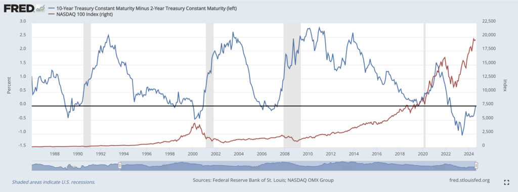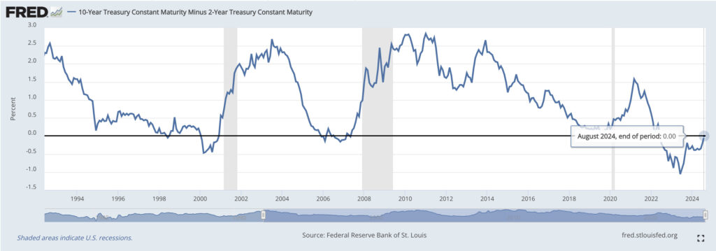 グレーの網掛けとなっているのは景気後退の期間ですが、逆イールドが解消していく過程でグレーの網掛けに突入しているのが見て取れますでしょうか。