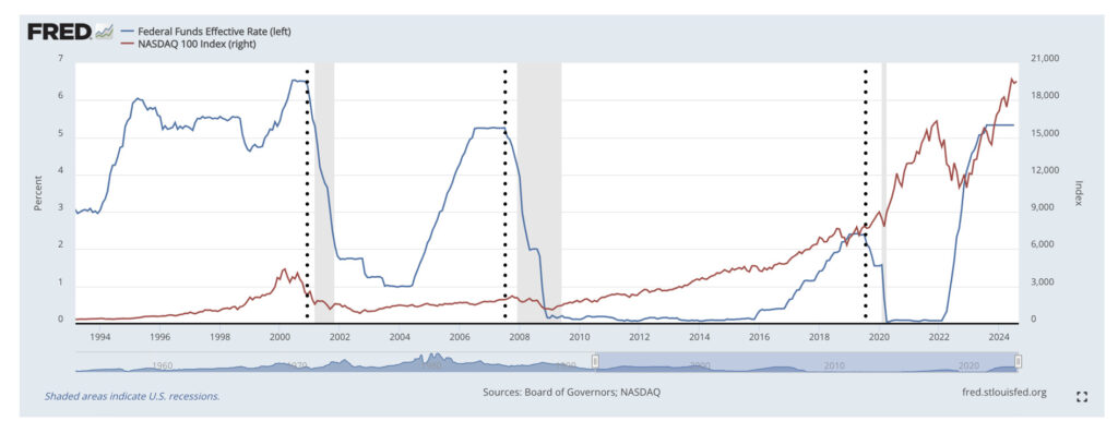 以下は、米政策金利とNASDAQ100株価の推移を示したグラフです。