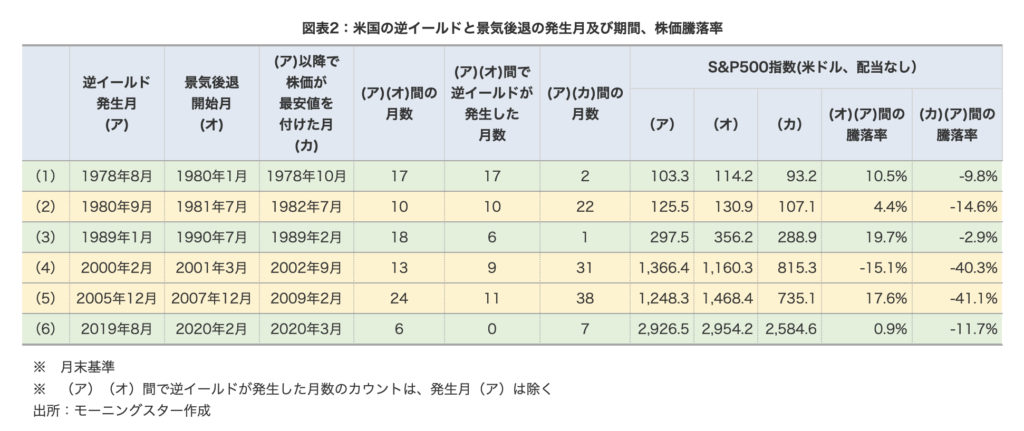 以前の記事でも紹介しましたが、以下は、モーニングスターが作成したもので、米国の逆イールドと景気後退の発生月及び期間、株価騰落率を示したものです。