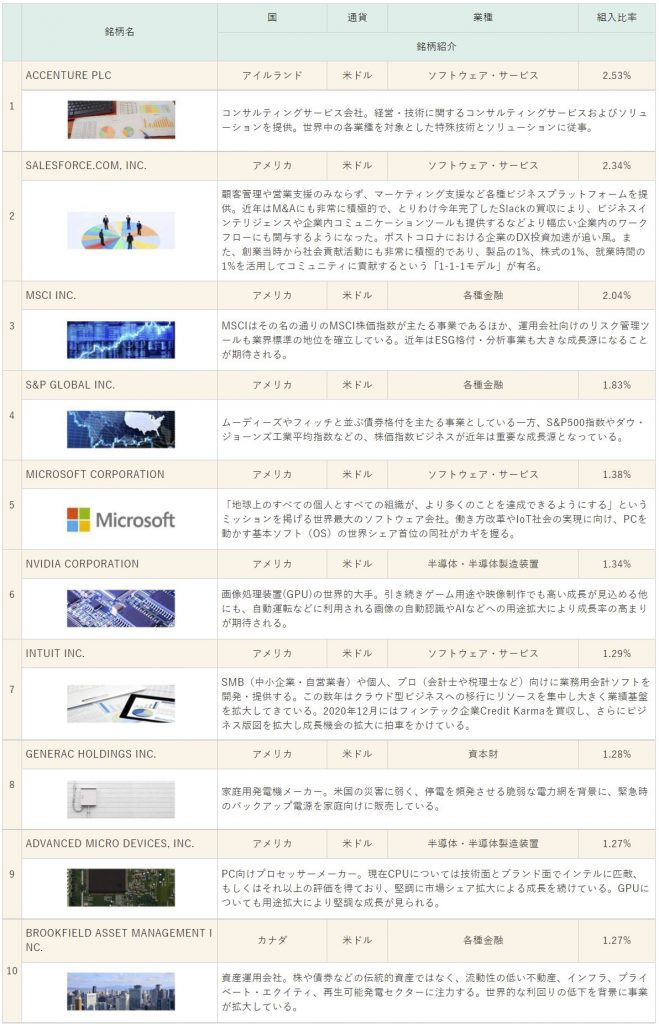 なるほどです。海外株式に投資する投資信託という理解で問題なさそうですね。具体的にはどんな会社に投資しているんでしょうか。