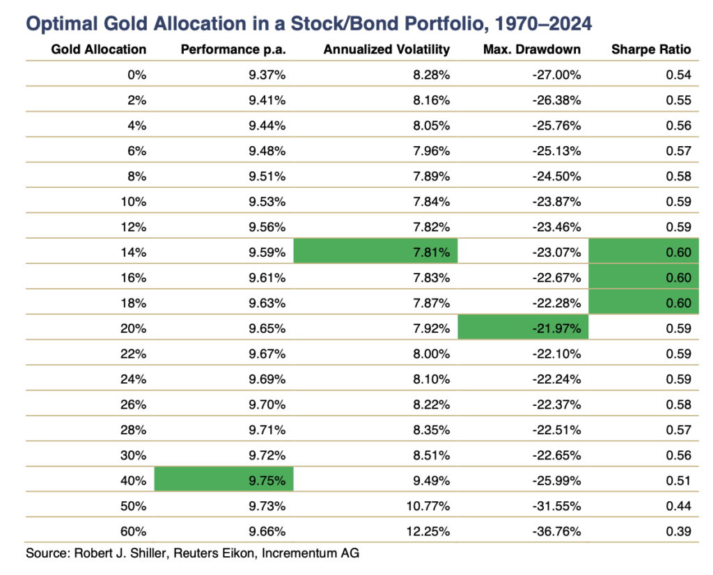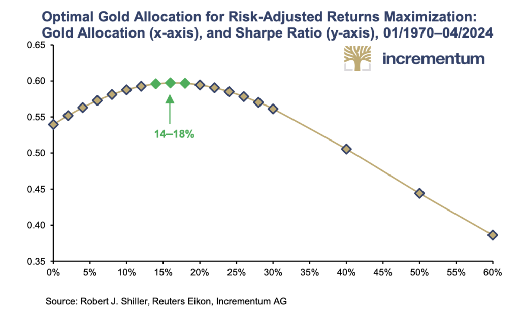また、彼らの調査結果によると、Goldを株式/債券ポートフォリオに統合すると、シャープレシオにプラスの影響があり、最適な配分は14〜18%になるようです。