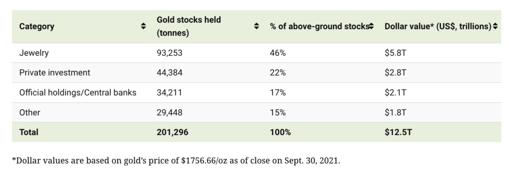 ちなみに、これまでに採掘されたGoldのほぼ半分は宝飾品の形で保有されておりますが、中央銀行のGold保有量はGold全体のほぼ5分の1を占めていると言われ、2021年時点で公式保有量は3万5,000トンを超えているとのことです。