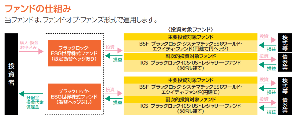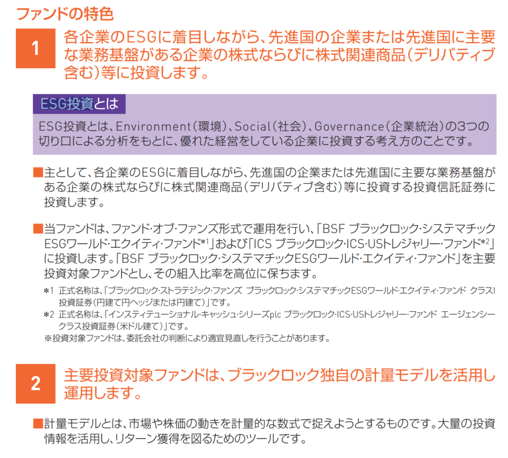 各企業のESGの取り組みに着目しながら、先進国企業または先進国に主要な業務基盤がある企業の株式に投資します。ファンド・オブ・ファンズ形式での運用となり、投資先ファンドは「BSF ブラックロック・システマチックESGワールド・エクイティ・ファンド」がメインになります。