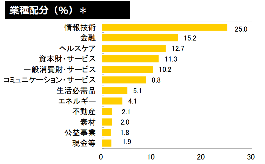 投資先上位はほぼ米国で70%を超えています。世界株式の名称ですが中身は米国株ですね。FANG+銘柄も多いです。業種別でもIT(情報技術)が25%と上位ですね。