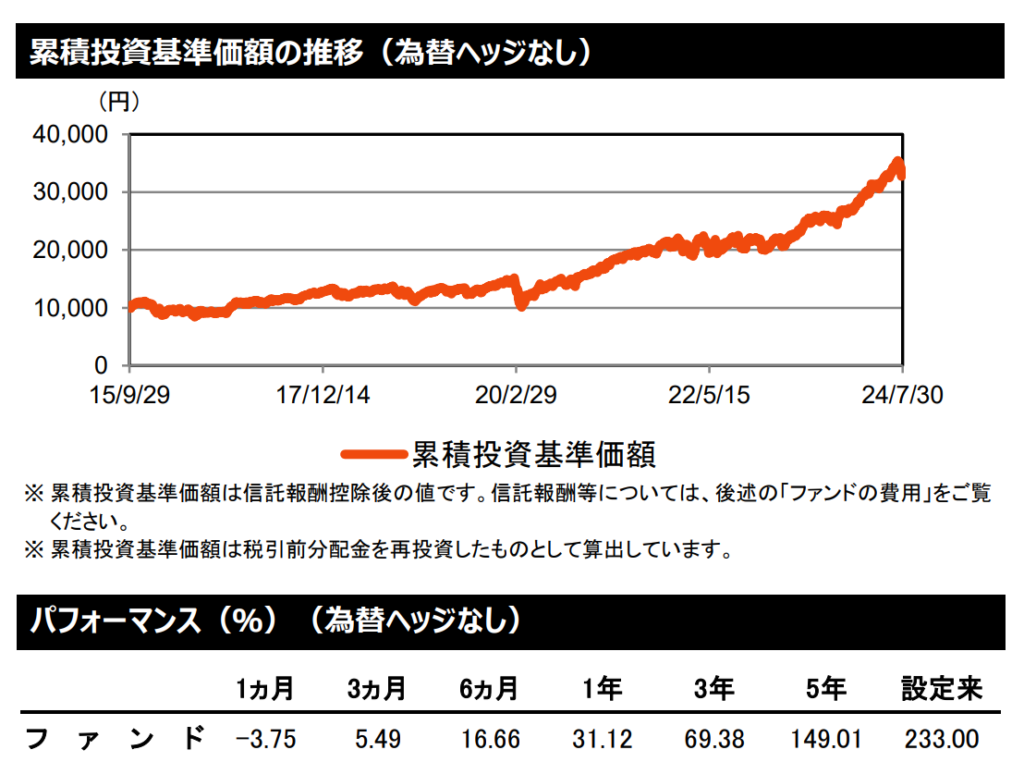 こちらのファンドは為替ヘッジあり/なしの2つのファンドがありますが、今回は為替ヘッジなしの数値で解説します。直近1年で+31.12%、3年で+69.38%の騰落率になります。