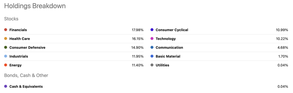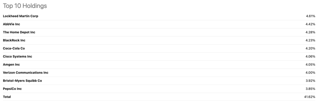 2024年9月13日時点での保有銘柄は103銘柄ですが、財務的に健全で、同業他社と比較して基本的な強みを持ち、安定した配当を支払っている米国企業で構成されています。