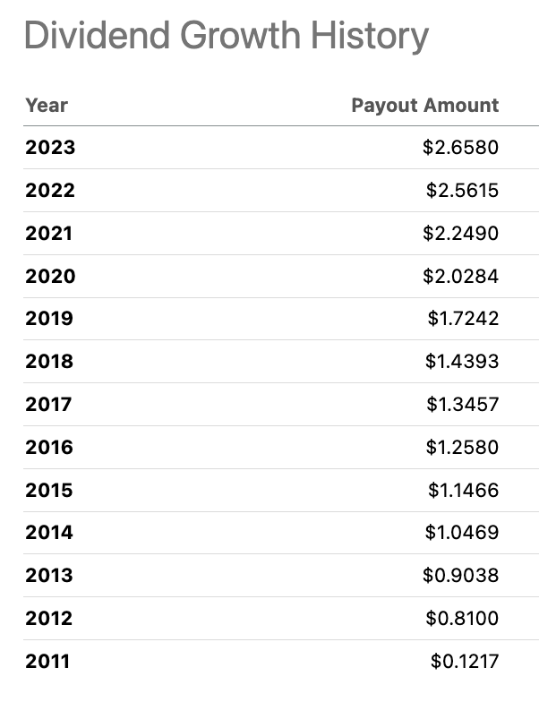 以下は、2011年10月20日の設定以来の1株当たりにおける配当金ですが、2011年は$0.1217だったものが2023年には$2.6580まで増えております。