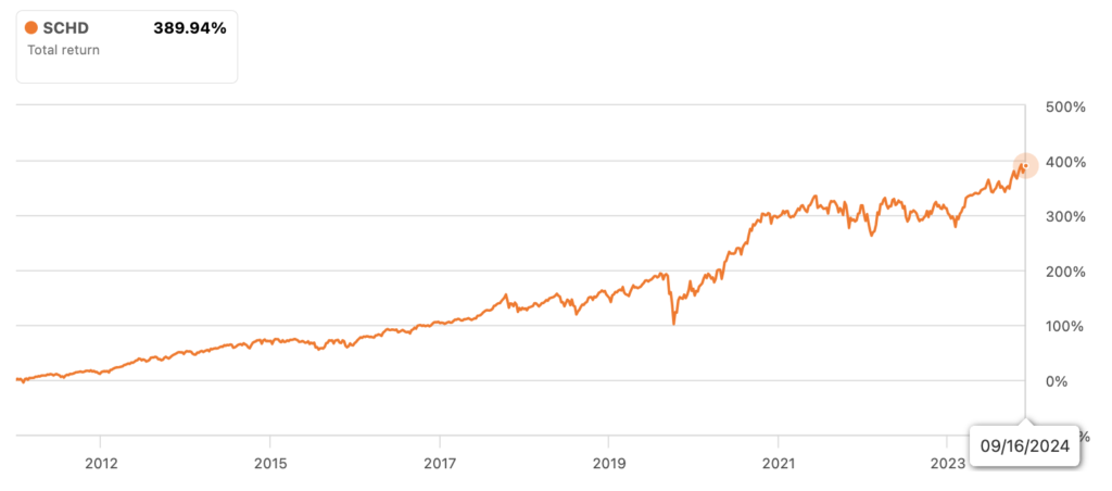 SCHDの設定は2011年10月20日ですが、設定来のトータルリターンは389.94%と13年でおよそ5倍近くまで増えております。