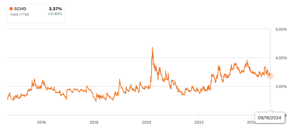 日本で高配当株ETFとして知られている「バンガード・米国高配当株式ETF(VYM)」の配当利回り(過去12ヵ月)は2.81%ですから、SCHDの配当利回りは魅力的ですね。