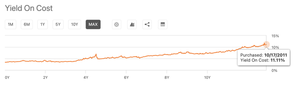 以下は、Yield On Costというもので、現在の年間配当を投資元本で割ったものになりますが、もし 2011年10月20日にSCHD投資していれば、現在の配当利回りは11.11%にもなっております。