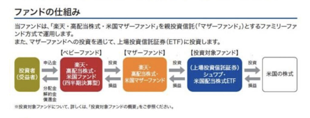 このファンドは「楽天・高配当株式・米国マザーファンド」への投資を通じて、「シュワブ米国配当株式ETF(SCHD)」に投資するものです。