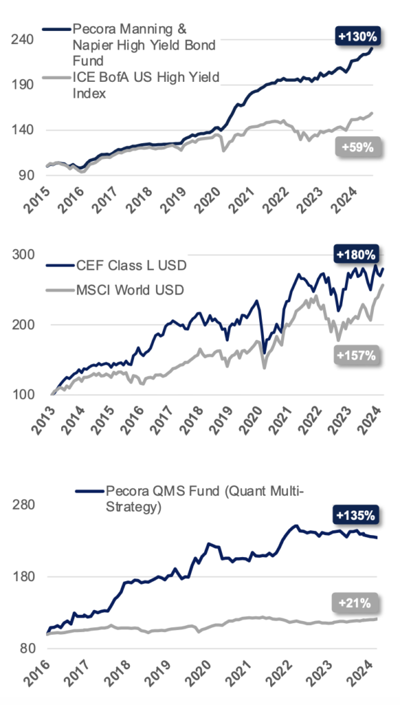 「Pecora Capital’s All-Weather Multi-Strategy Portfolio」は、Pecora Capital LLCが運用している以下3つのファンドのそれぞれに3分の1ずつ割り当てて運用しています。