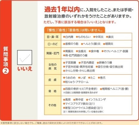 - 緩和型医療保険なないろメディカルスーパーワイドの告知は2項目のみで、その内容もゆるやか