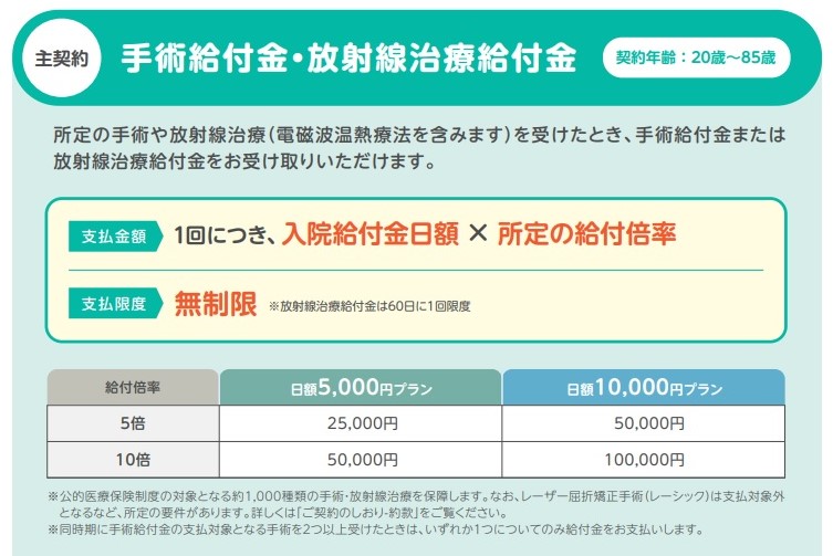 所定の手術や治療を受けたとき、保障されます。給付金額は、入院給付金の0倍(なし)・5倍・10倍の3タイプから選択。支払限度は無制限です(放射線治療は60日に1回)。