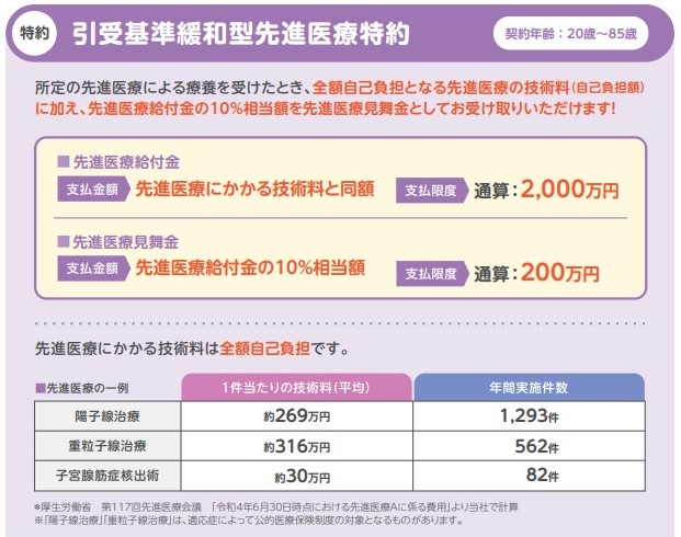 所定の先進医療による療養を受けたとき、技術料の同額(通算2,000万円限度)と、一時金として技術料の10%(通算200万円限度)が支払われます。