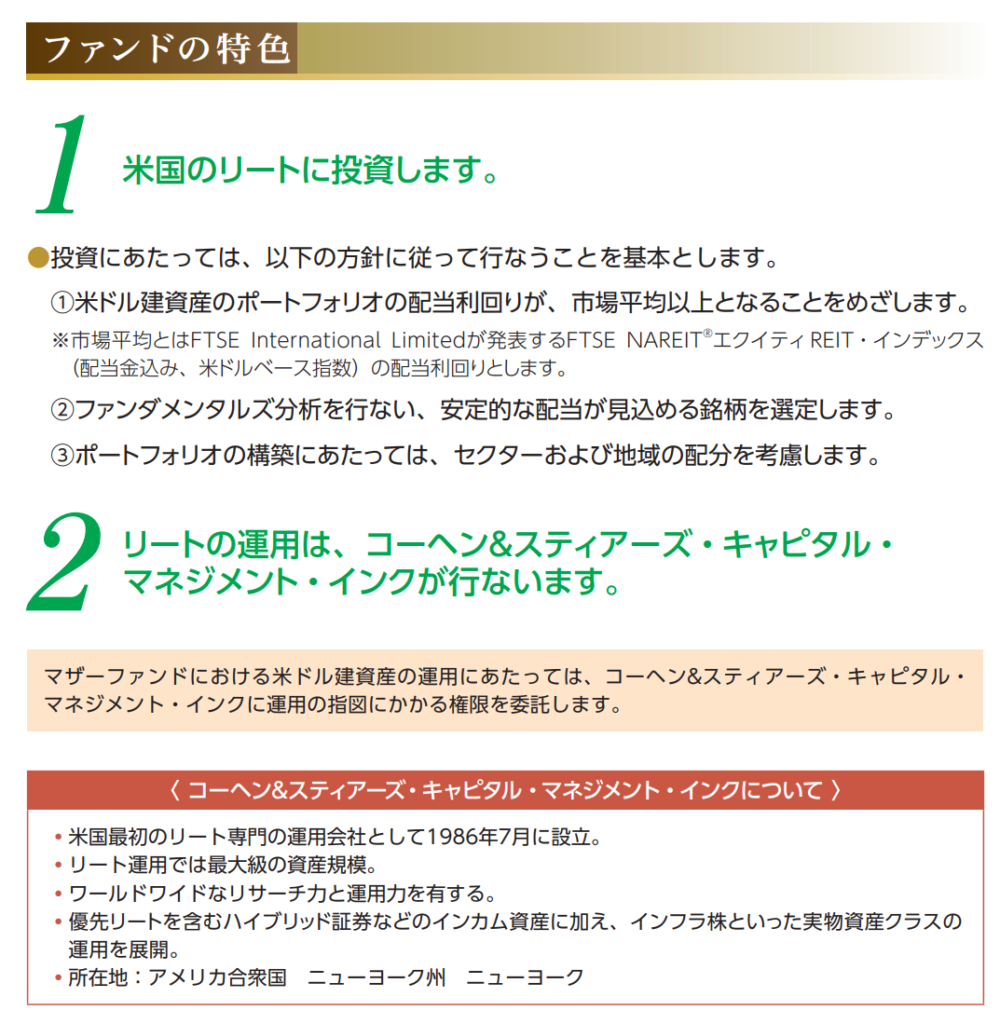 ポートフォリオの配当利回りが、市場平均以上となることを目指して運用を行い、運用指図権限は米国リート運用大手、コーヘン&スティアーズ・キャピタル・マネジメント・インクに委託します。ベンチマークはFTSE NAREIT エクイティ REIT・インデックス(配当金込み、円ベース指数)となります。