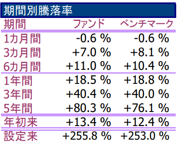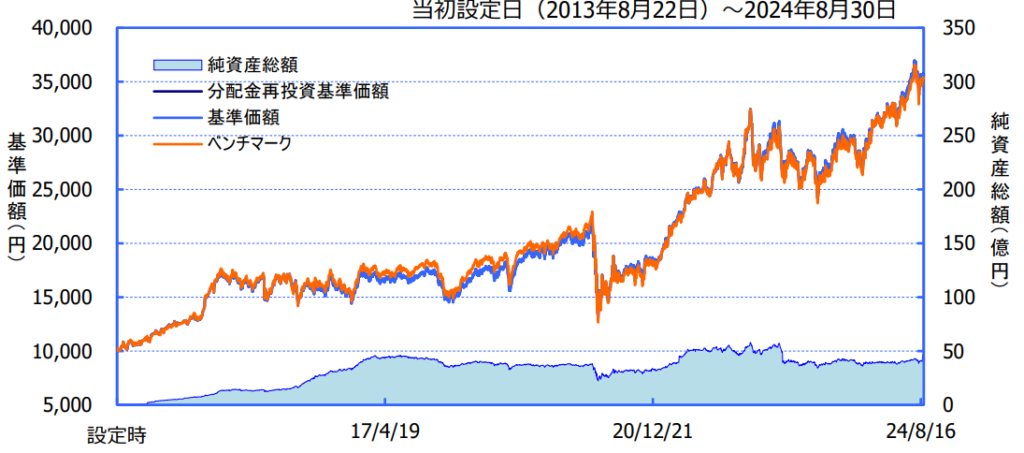 直近1年で+18.5%、3年で+40.4%の騰落率になります。ファンド設定時から配当金は再投資されていて分配金実績はありません。ベンチマークは先ほども触れたFTSE NAREIT エクイティ REIT・インデックス(配当金込み、円ベース指数)です。