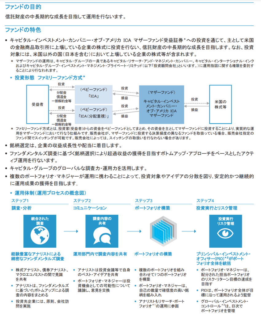 企業の収益成長性や配当に着目し、主に米国の上場企業に投資します。キャピタル・グループのグローバルな調査力・運用力を活用し運用指図権限はグループ内企業に委託する事になります。日本でのファンド設定は2018年1月ですが、マザーファンドはキャピタル・グループ設立後最初に設定した投資信託で1934年に運用開始しています。