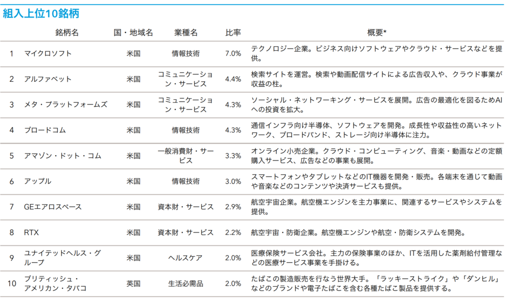 業種別構成比はバランスよく投資されていますが、比率、組み入れ上位はIT、その中でもFANG銘柄が多いですね。