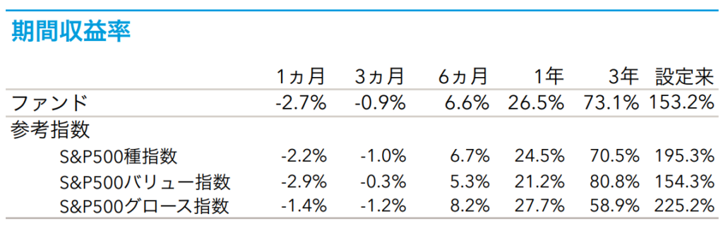 こちらのファンドは年1回決算(分配金なし)、年2回決算(分配金あり)の2種類がありますが、今回は年1回決算(分配金なし)の数値で解説します。直近1年で+26.5%、3年で+73.1%の騰落率になります。