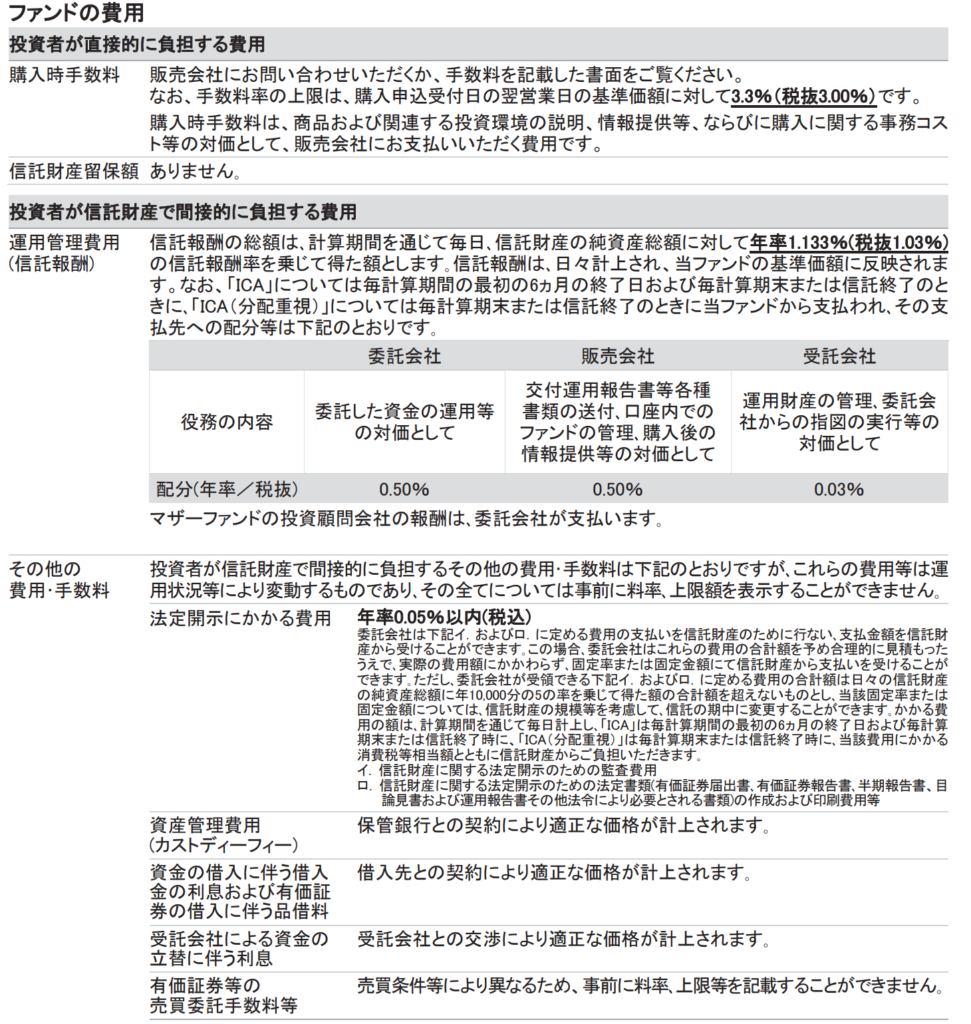 1年、3年とS&P500よりも騰落率がいいですが、設定来では劣後していますね。このファンドは歴史があるので、本家米国ファンドの長期でのパフォーマンスはS&P500より良いのだと思いますが、日本ではマザーファンドに直接投資できませんし、かかる手数料が多いですからね。この点をどう考えるか悩むところです。