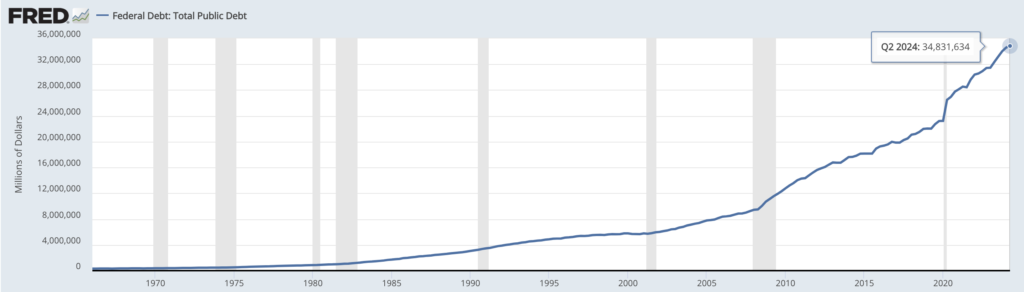 米国の公的債務は、2024年10月現在、約 34.83 兆ドルに達しており、これは、継続的な政府支出と金利コストの上昇により、前年に比べて大幅に増加しています。