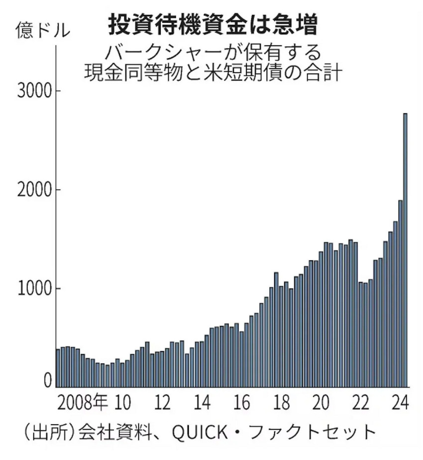 ただ、このかなりの部分(2,346億ドル)を「短期米国債」で保有しており、バフェットは短期米国債を「最も安全な投資」と呼び、資本保全への取り組みを強調している