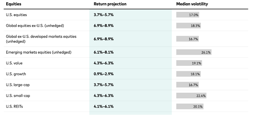 また以下は、2024年3月22日にバンガードが公表した金融市場見通しですが、今後10 年間の米国株の年率リターンは3.7%〜5.7%と見込んでおります。
