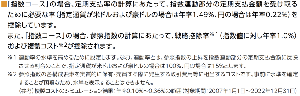 指数コースは定期支払金が定額部分指数連動部分の2つに分かれます。定額部分は契約時の積立利率で固定されます。指数連動部分はBNPパリバが提供する「米国投資戦略指数」に100%連動してリターンがあれば支払金が発生し、リターンがなければ支払金はありません。つまり毎年受け取れる金額は変動するということです。