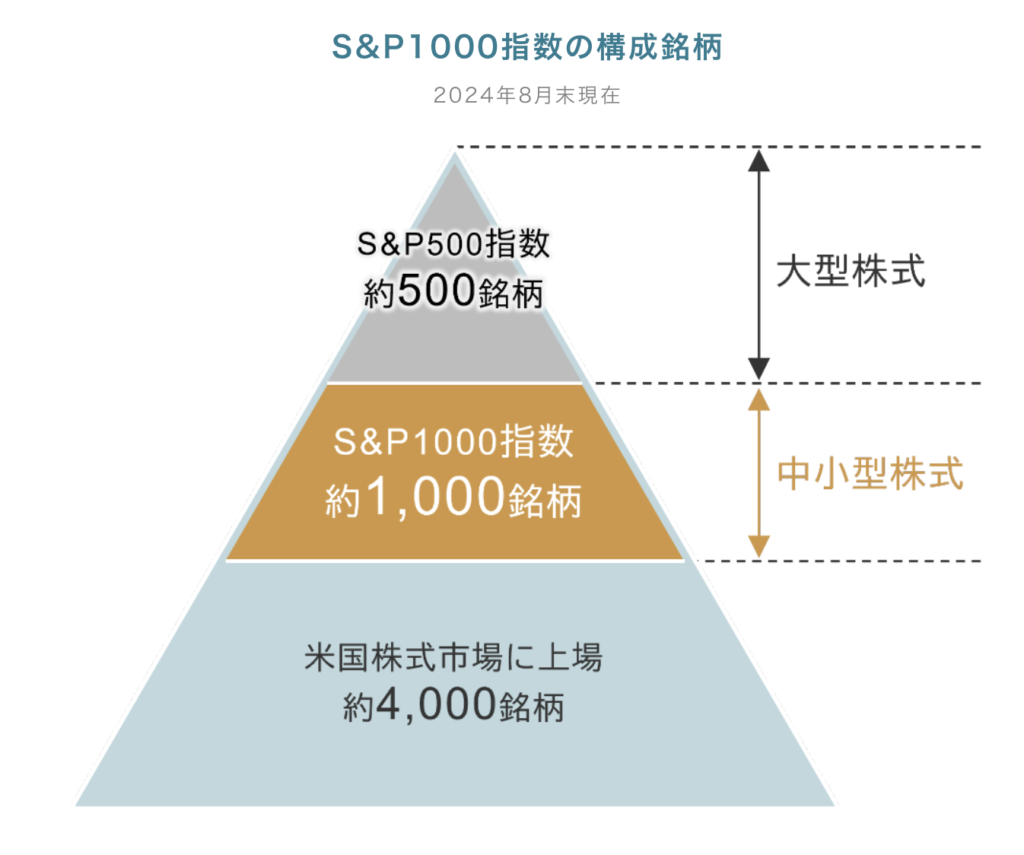 多くの一般投資家が投資しているS&P500は米国に上場する大企業約500銘柄をカバーしておりますが、S&P1000指数は、中型株約400銘柄と小型株約600銘柄の約1,000銘柄をカバーしております。