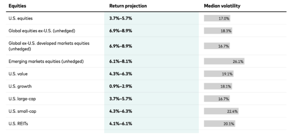 例えば、以下は2024年3月22日にバンガードが公表した金融市場見通しですが、今後10 年間の米国大型株の年率リターンは3.7%〜5.7%米国小型株の年率リターンは4.3%〜6.3%と見込んでおり、小型株の方がリターンは高くなると考えられております。