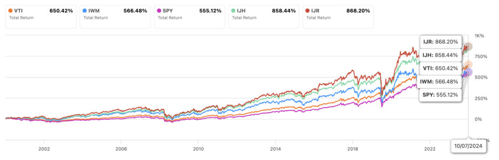 ただ、トータルリターンの比較を見ていただくと、他のETFに対して「IJR」と「IJH」が抜きん出ているのが確認できるかと思います。