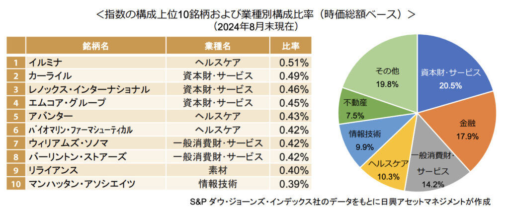 「Tracers S&P1000インデックス(米国中小型株式)」の設定は11月12日で運用はこれからですが、2024年8月末時点の構成上位10銘柄と業種別構成比率は以下となっております。