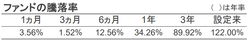 こちらのファンドは為替ヘッジあり/なしがありますが、今回は為替ヘッジなしの数値で解説します。直近1年で+34.26%、3年で+89.92%の騰落率になります。