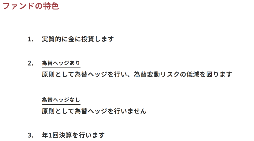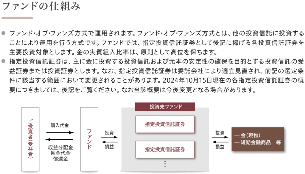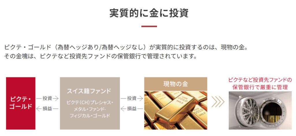 ファンド・オブ・ファンズ方式での運用となり、スイス籍ファンドのピクテ(CH)プレシャス・メタル・ファンド-フィジカル・ゴールドに投資します。このスイス籍ファンドは現物の金に投資するファンドです。
