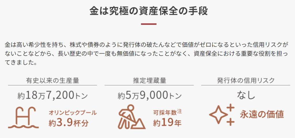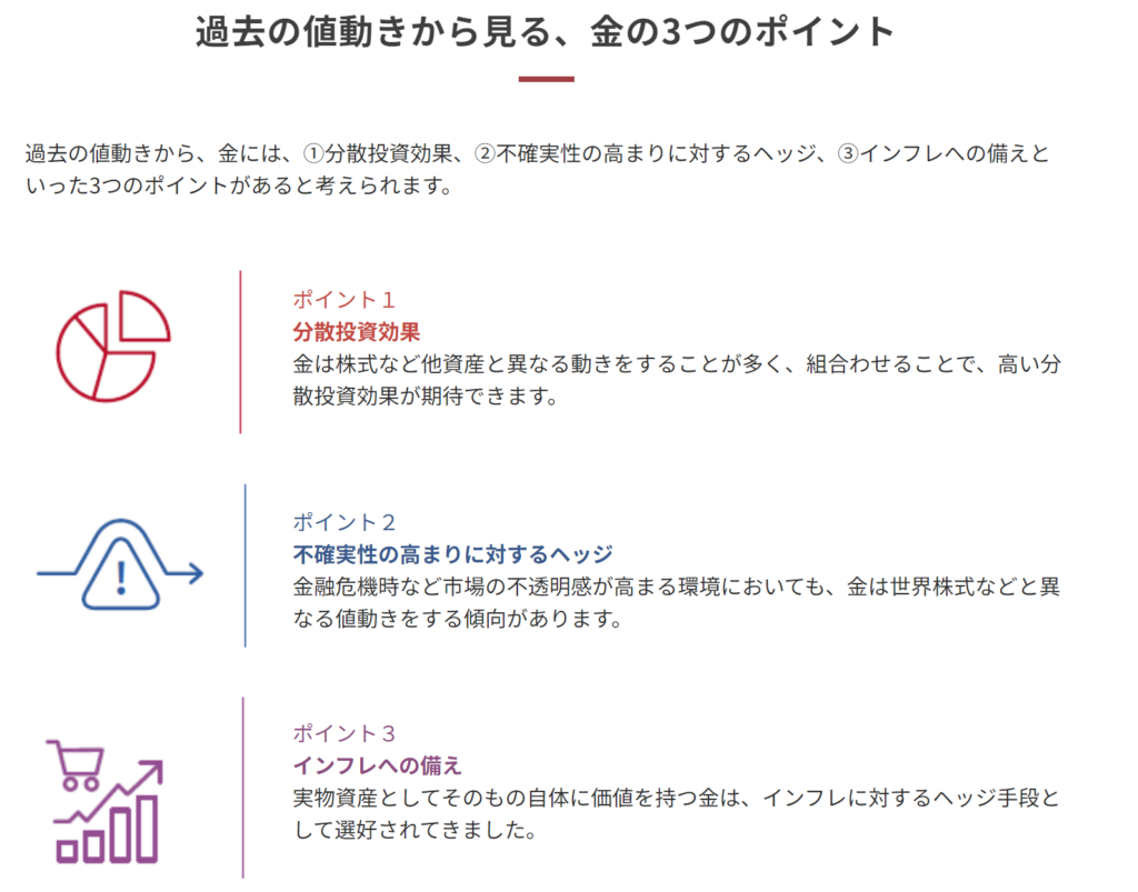 そうですね。先ほどのスライドにもありましたが、「金は究極の資産保全の手段」です。現金のままだとインフレなどで価値が下がってしまう中、良いヘッジになると思います。株に比べると地味ですがポートフォリオに入れておくと良いかと思います。