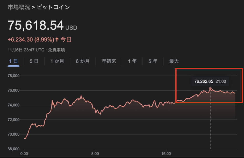 ビットコインは今朝6時頃(日本時間)に史上最高値を更新し、76,000ドルに到達しました。