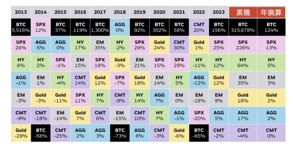 以下は、ビットコインと主要な資産クラスとパフォーマンスを比較した表ですが、ビットコイン(BTC)のパフォーマンスを見てみると累積リターンは315,678%、年換算リターンで124%と、とんでもないリターンを上げています。