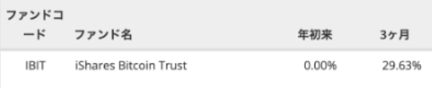そして、ビットコインETFである「iShares Bitcoin Trust」のパフォーマンスも出ておりましたので確認しましたところ、ローンされてから3ヶ月で29.63%のリターンとなっておりました。
